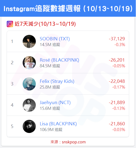 ➡️ Rosé (BLACKPINK) -2.6萬 (-0.05%) ⭣