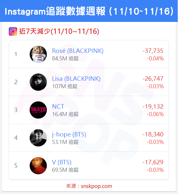➡️ Rosé (BLACKPINK) -3.8萬 (-0.04%)⭣