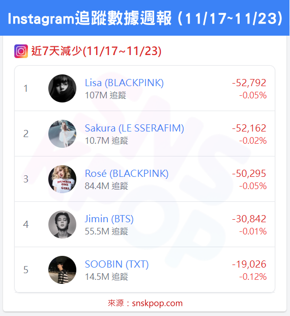 ➡️ Lisa (BLACKPINK) -5.2萬 ⭣