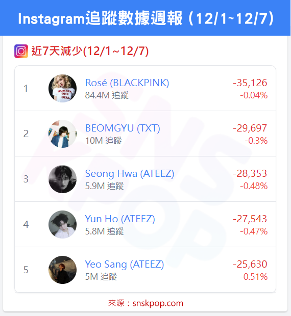 ➡️ Rosé (BLACKPINK) -3.5萬 (-0.04%)⭣
