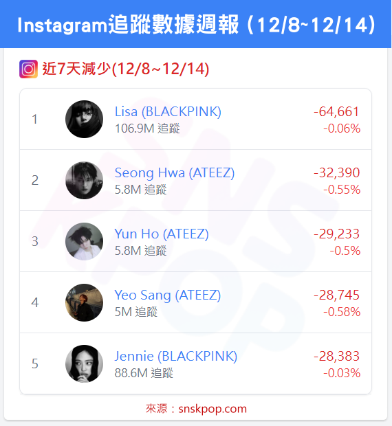 ➡️ Jennie (BLACKPINK) -2.8萬 (-0.03%)⭣