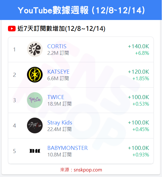 ➡️ CORTIS +14萬 (+6.8%),訂閱三連冠達成!🏆