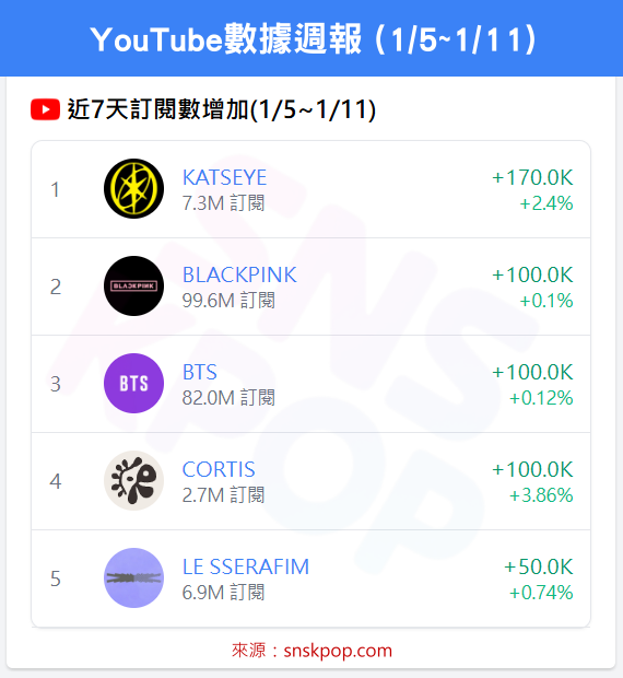 ➡️ BLACKPINK、BTS、CORTIS +10萬並列第二!⚡