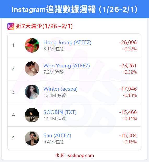 ➡️ Hong Joong (ATEEZ) -2.6萬 (-0.32%)⭣