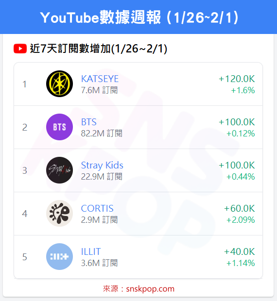 ➡️ KATSEYE +12萬 (+1.6%),訂閱數成長五連霸!👑