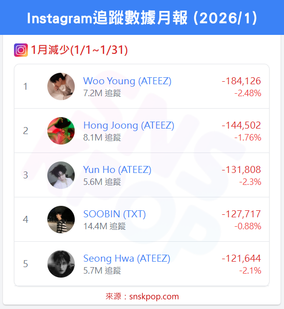 ➡️ Seong Hwa (ATEEZ) -12.2萬 (-2.1%)⭣