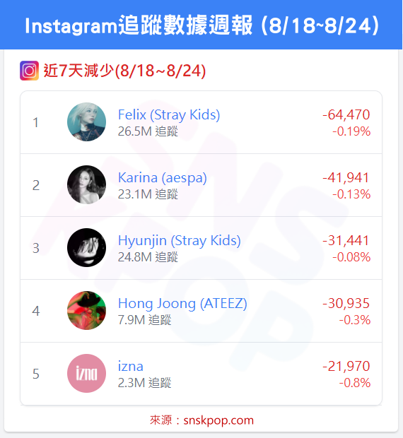 ➡️ Stray Kids Felix 和 Hyunjin,aespa Karina、ATEEZ Hong Joong 追蹤數持續下滑,但幅度已縮小。
