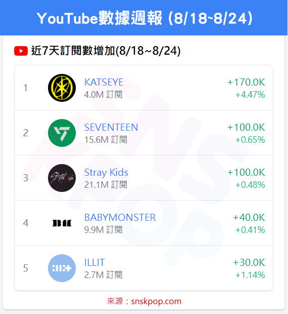 📊 YouTube數據週報 (8/18~8/24)-KATSEYE三連冠