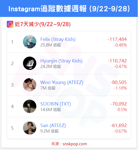 ➡️ Felix (Stray Kids) -11.7萬⭣